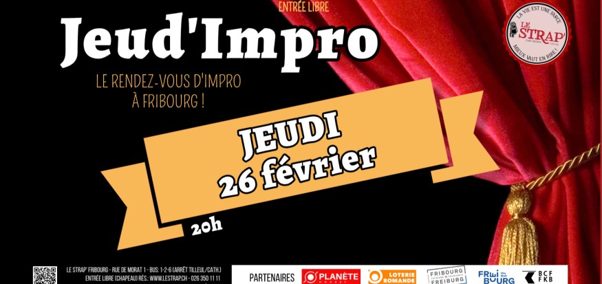 Chaque dernier jeudi du mois, le rendez-vous incontournable de l'improvisation en ville de Fribourg. On sait comment ça commence, jamais comment ça s'achève. Rires garantis !
