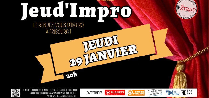 Jeud'Impro, c'est prendre rendez-vous pour un spectacle improbable. On sait comment ça commence, on ignore comment ça finit. Un thème, un contexte, des personnages et c'est parti. L'imagination des artistes n'a pas de limites et nous offre situations plus cocasses les une que les autres. Jeud'Impro, c'est tous les derniers jeudis du mois.